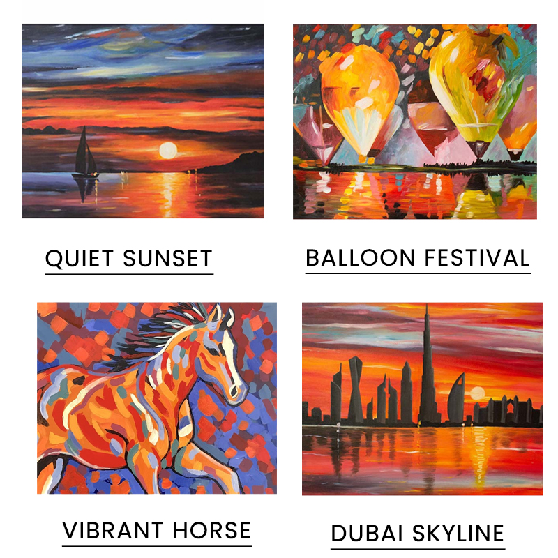 We advise booking well in advance as spaces are limited. The painting options for this event are Quiet Sunset, Balloon Festival, Dubai Skyline, Vibrant Horse.