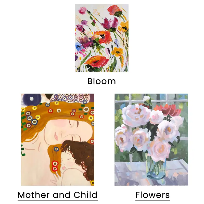 We advise booking well in advance as spaces are limited. The painting options for this event are Bloom, Mother and Child, Flowers.