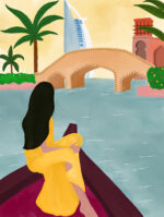 In ‘Dubai Dhow’, a girl enjoys a peaceful ride in a traditional dhow boat, surrounded by the stunning sights of Dubai. The iconic Burj Al Arab towers on one side, while traditional barjeel houses reflect the region’s rich heritage.