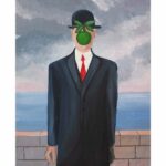 The Son of Man by Rene Magritte, 1964, is a famous Surrealist self-portrait depicting a suited gentleman with an apple hovering in front of his face. The man’s face is largely obscured by the hovering green apple. However, the man’s eyes can be seen peeking over the edges. The actual painting is privately owned and rarely goes on display for the public.